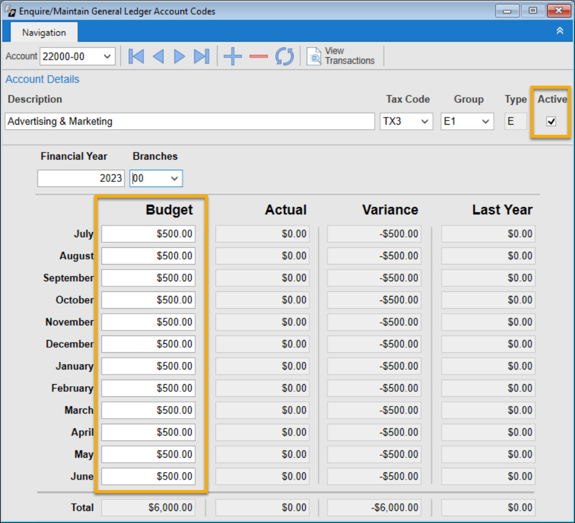 Budgets are handled on the same screen shown above.  Navigate to the relevant account codes and enter the monthly budgets as shown.  If using branches, ensure you are on the correct branch.